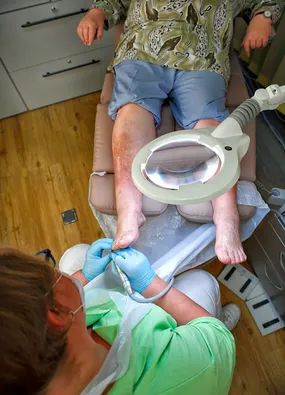 Ausgelöst durch den Diabetes kommt es durch Zerstörung und/oder Ablagerungen zu Nervenstörungen und/oder Durchblutungsstörungen an den Füßen. Patienten mit Nervenstörungen (Neuropathie) und/oder Durchblutungsstörungen (Angiopathie) haben u.a. meistens auch eine eingeschränkte Schweißbildung an den Füßen. Dies führt dazu, dass die Haut rissiger und trockener wird.