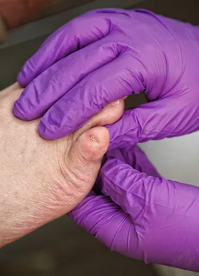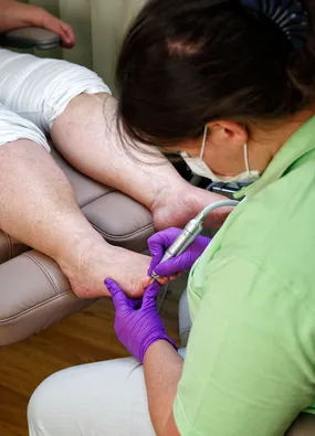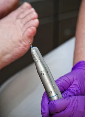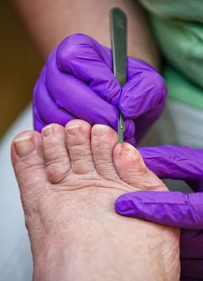 Ein Hühnerauge ist eine begrenzte punktuelle Verhornung, häufig mit einem Kern, welche trichterförmig in das Hautgewebe eingedrungen ist. Ursache: Falsche Schuhe oder Strümpfe, Fußfehlstellungen, Verletzungen der Fußknochen. Durch Druck und Reibung (Hitzeentwicklung) wird eine Reizung der Haut hervorgerufen. Die Haut versucht sich auf diese Art vor Verletzungen zu schützen. Wenn die Ursache jedoch nicht beseitigt wird oder nicht beseitigt werden kann, entstehen durch die in die tieferen Hautschichten eindrückende Verhornung dann starke Schmerzen mit der Folge, dass der betroffene Patient in seiner Bewegung eingeschränkt wird. Vorzugsweise entstehen sie auf/an den Zehen, zwischen den Zehen, an der Fußsohle oder auch an den Fußseiten. Am wichtigsten ist es die Ursache (wenn möglich) zu beseitigen. Wenn dies nicht möglich ist, sollte vom Podologen oder orthopädischen Schuhmacher ein effektiver Druckschutz angelegt werden.